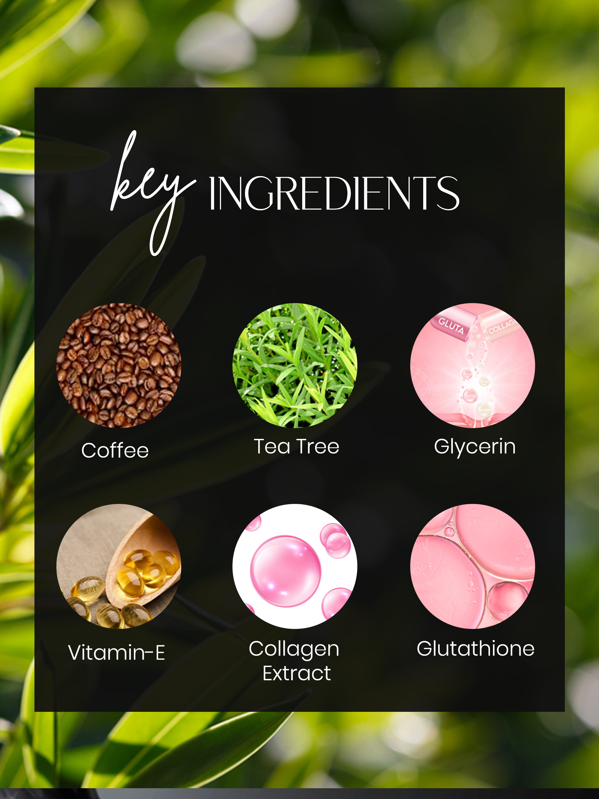 ₹35.00- Natural Blend : Combines coffee, tea tree oil, Vitamin E, and Glutathione for a comprehensive skincare treatment.