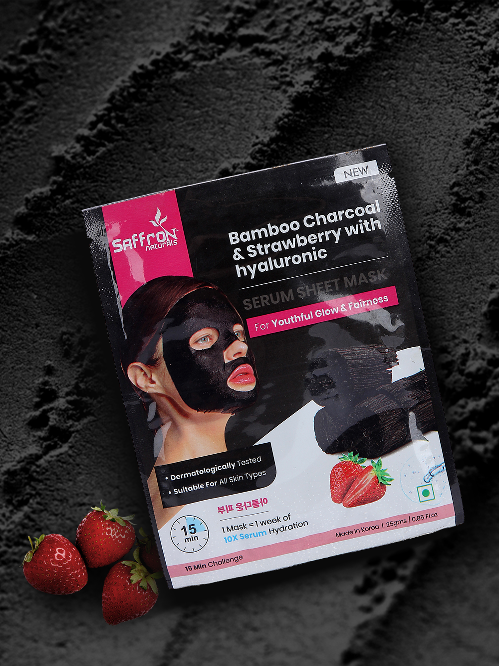 - Refreshing and Effective : Ideal for a quick skin rejuvenation or as part of your regular beauty regimen. Experience the dual benefits of cleansing and brightening with the Bamboo Charcoal & Strawberry with Hyaluronic Acid Serum Sheet Mask from Saffron Naturals. Enjoy the refreshing boost and youthful glow your skin deserves.
