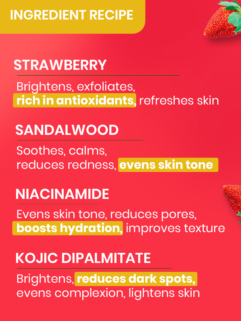 - Deep Hydration : Nourishing ingredients like strawberry and sandalwood provide essential moisture, leaving your skin hydrated and plump.