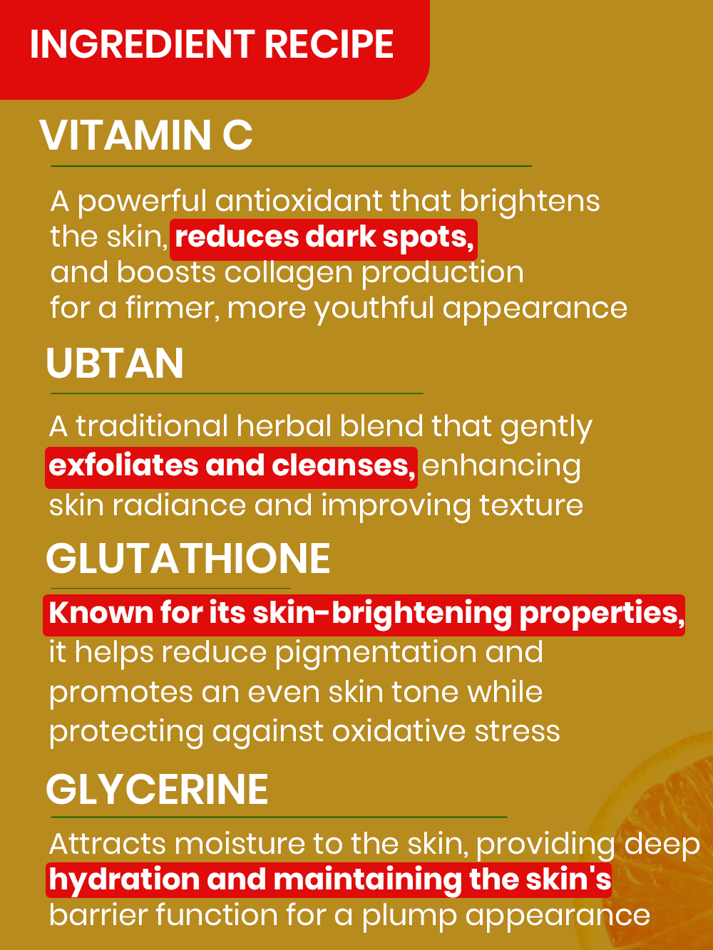 • Vitamin C & Ubtan Cream (410 g): A luxurious cream that hydrates and brightens the skin. Infused with vitamin C and glutathione to reduce dark spots and enhance radiance.